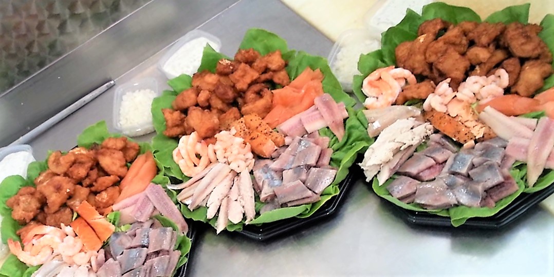 Feestje? Onze vis schotels worden vers en royaal bereid met kibbeling, haringmootjes, gerookte zalm, palingfilet, Noorse garnalen, grote staartgarnalen, makreel filet en warm gerookte zalm mootjes.
